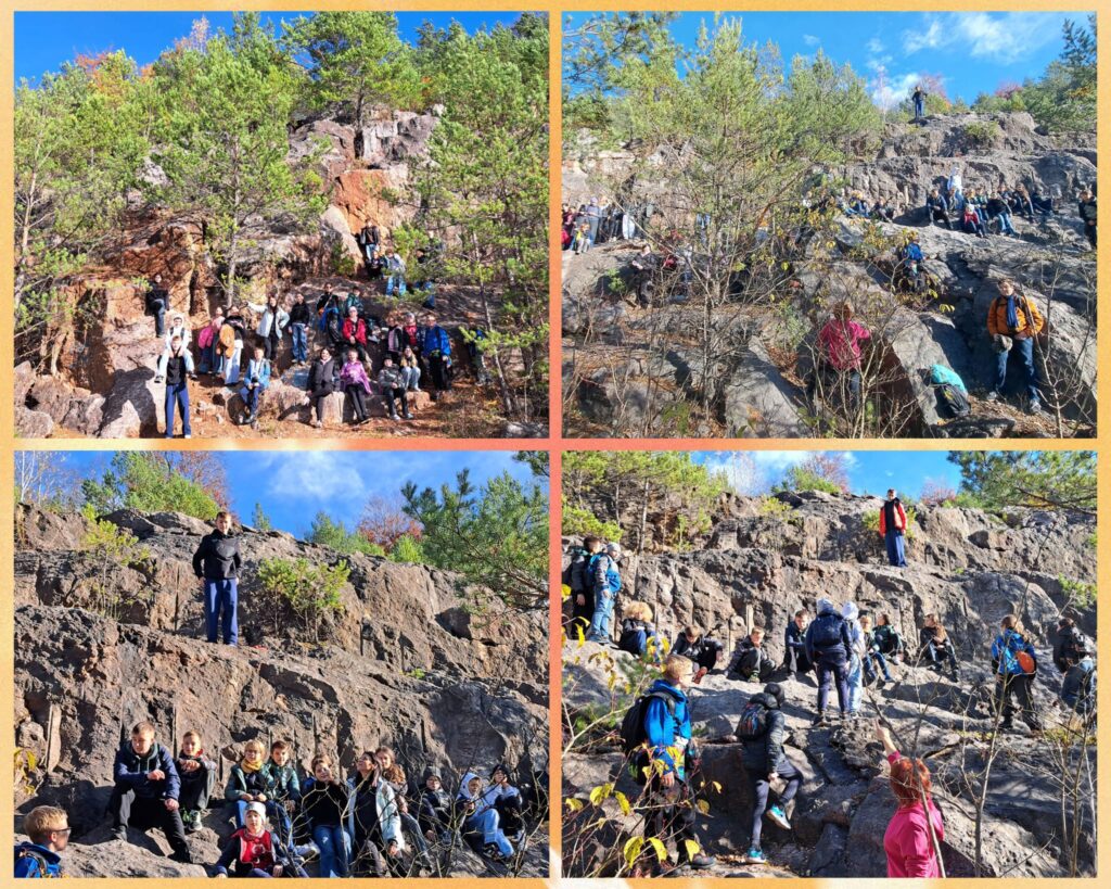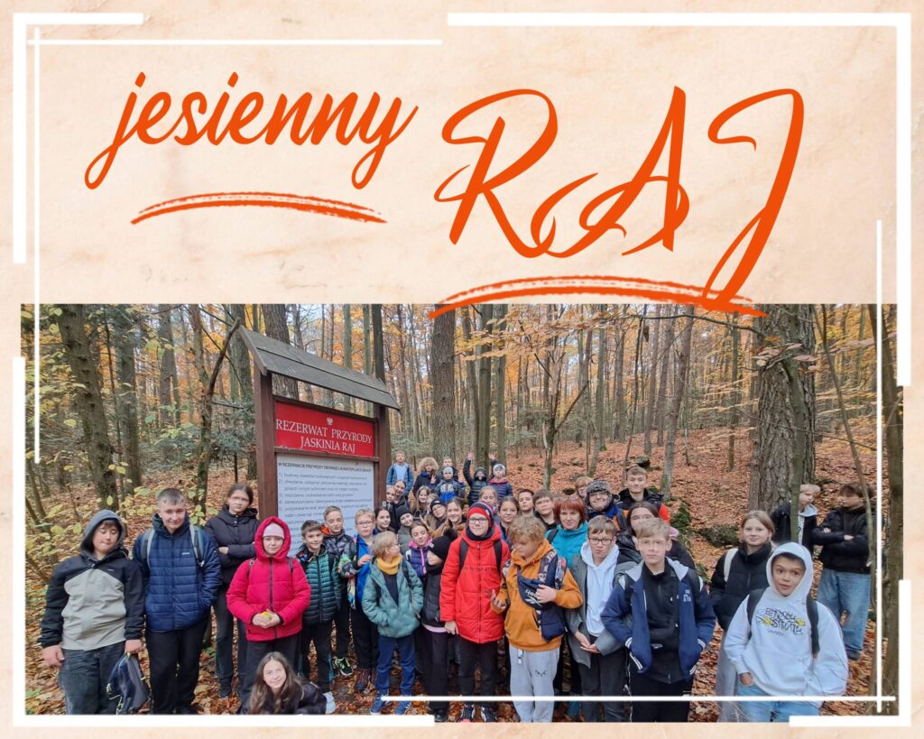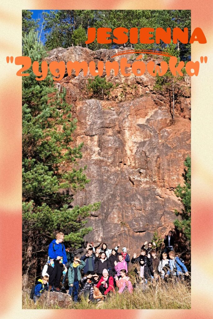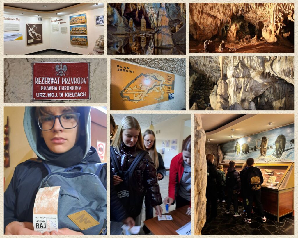 Pogoda dopisała – było słonecznie i ciepło, jak na koniec października wręcz idealnie. Wędrówka czerwonym szlakiem, wśród dywanu jesiennych liści i w otoczeniu promyków słońca była magiczna. Podczas zwiedzania Kamieniołomu Zygmuntówka uczniowie mieli okazję zobaczyć z bliska (niektórzy nawet z bardzo bliska) budowę geologiczną regionu oraz dowiedzieć się, jak powstają skały wapienne. Usłyszeli kilka faktów i ciekawostek o historii Kolumny Zygmunta III Wazy sprzed Zamku Królewskiego w Warszawie i jej powiązaniach z naszym wyrobiskiem. Później czekała na wszystkich prawdziwa gratka – Jaskinia Raj, jedno z najpiękniejszych miejsc tego typu w Polsce. Stalaktyty, stalagmity i podziemne korytarze zrobiły na wszystkich ogromne wrażenie, poznanie zjawisk krasowych z naszego regionu wielu zaskoczyło.