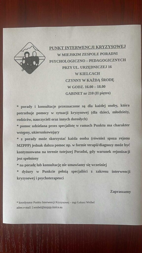 Kryzysowy Telefon Zaufania dla dorosłych 116 123 (codziennie, poza świętami, w godz. 14:00 – 22:00)