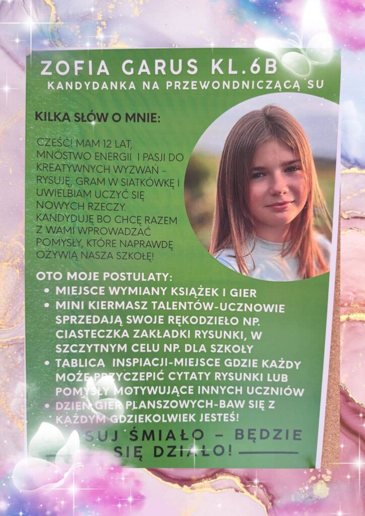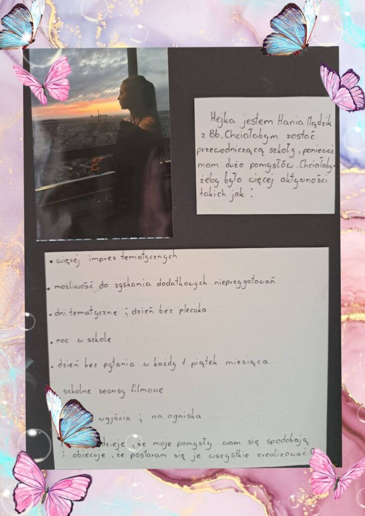 „Już za chwileczkę czeka nas wielka lekcja demokracji 🙂 wybieramy nasz samorząd… nasi kandydaci swoje kandydatury już prezentują od ubiegłego tygodnia na holu głównym, oto oni 😁🤗 Zapraszamy do gremialnego głosowania w najbliższą środę, 4 października – wybierzmy najlepszego Przewodniczącego!”