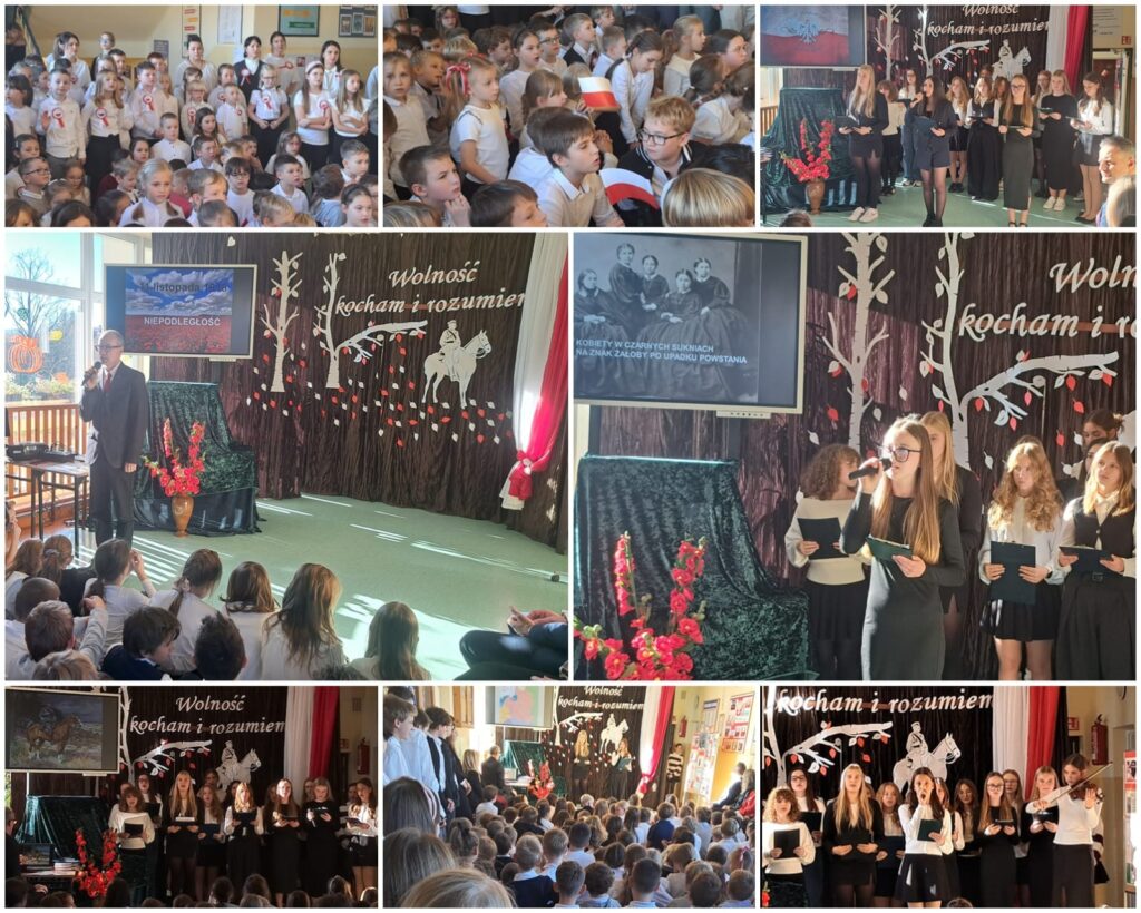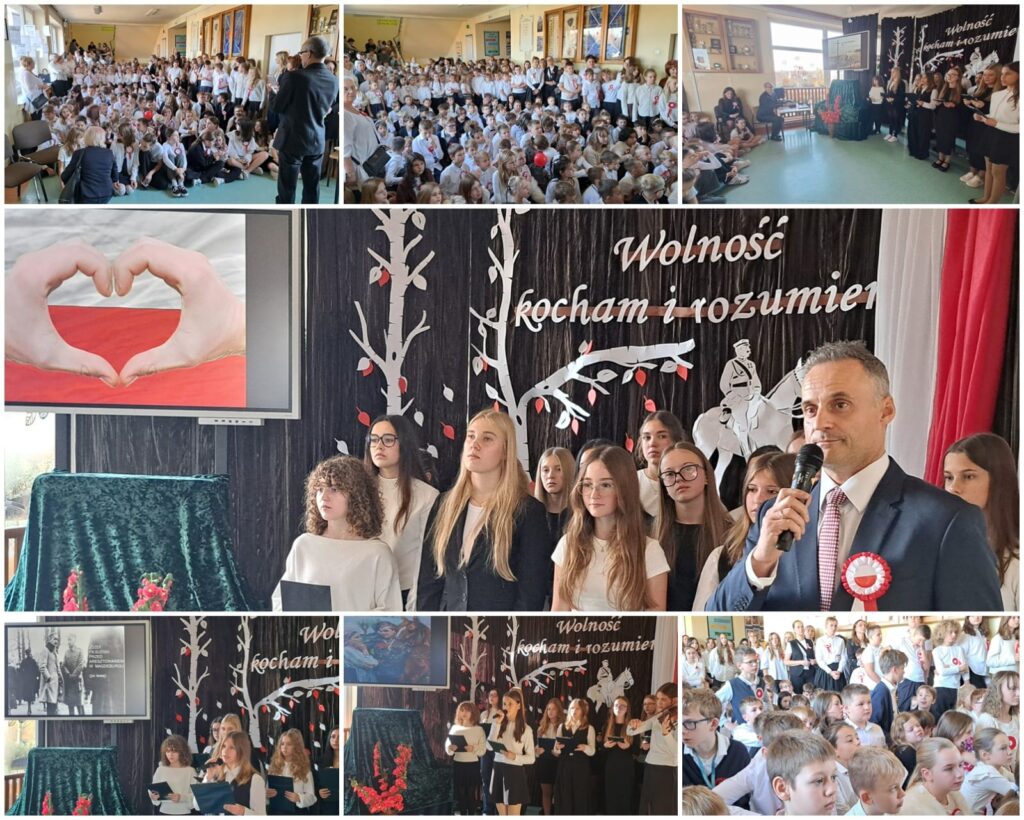 🇵🇱 🇵🇱 🇵🇱 W piątek, 7 listopada, wszyscy uczniowie, nauczyciele i pracownicy szkoły wzięli udział w uroczystym apelu z okazji 107 rocznicy odzyskania przez Polskę niepodległości. Scenariusz słowno-muzyczny w wykonaniu uczennic klas 5b, 7b i 8c oraz chóru z klasy 4b był przejmującą podróżą przez lata zaborów i czarnych sukienek… Jego twórczyni, mgr Wiesławie Herbergier udało się wydobyć ze słów dziewcząt nuty tęsknoty, nostalgii, zadumy i euforię zwycięstwa. Muzyka i obrazy przygotowane przez mgr Dariusza Orkisza, działały na zmysły zgromadzonych i nadawały całości podniosłego charakteru. Kończący apel hymn odśpiewany przez uczestników spotkania pozwolił wybrzmieć radości pięciuset gardeł.