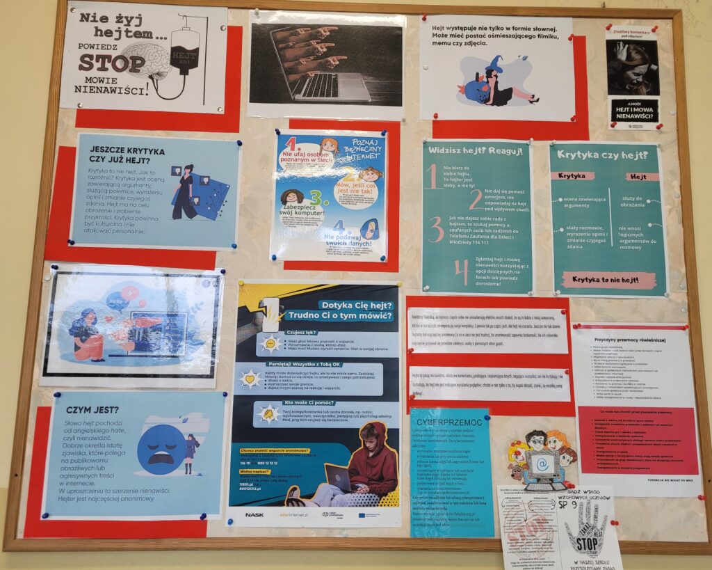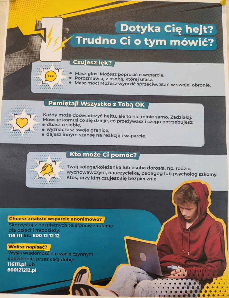 Bibliotekarze także włączyli się w tę ważną inicjatywę i przygotowali dla uczniów gazetkę ścienną na temat przeciwdziałania przemocy rówieśniczej pt. „Nie żyj hejtem…Powiedz STOP mowie nienawiści!”. Szczegółowo wyjaśnili czym jest hejt, jak na niego reagować, a przede wszystkim gdzie i w jaki sposób szukać pomocy.