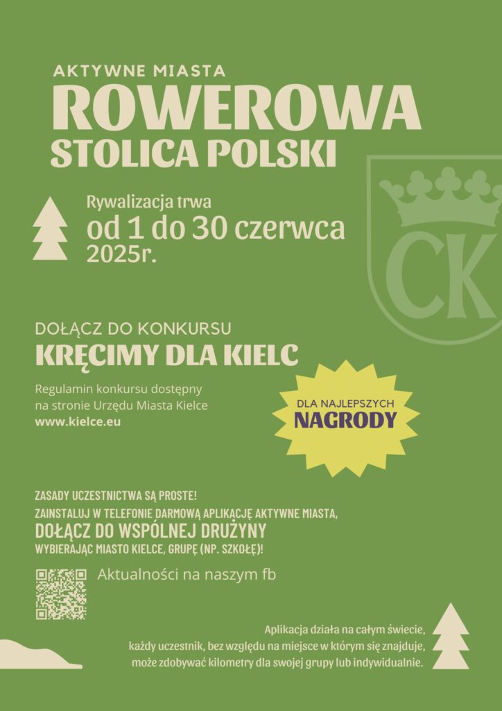 ✅ Dodatkową atrakcją w ramach rywalizacji o Puchar Rowerowej Stolicy Polski jest konkurs „Kręcimy dla KIELC” organizowany przez Urząd Miasta Kielce. Zwycięska szkoła otrzyma 2 000 zł, za zajęcie 2. miejsca – 1 500 zł, za 3. miejsce – 1000 zł . Dodatkowo dla 3 najlepszych uczniów, uczennic, którzy wykręcą największą ilość kilometrów przygotowano karty podarunkowe na zakup sprzętu sportowego.